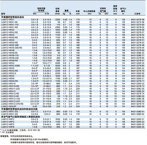 LUM手枪式系列拥有多个不同型号: HR:采用非平衡式握把的工具握把,适用于需要施加进给力的操作,适用小反作用力的操作。 HRX:采用平衡握把的工具具有极为优异的平衡性,适用于标准手枪式持握的工位。 HRF:平衡握把并具备多个进气口,可实现灵活连接。可提供名称中包含RE前缀的计数式型号。可提供名称中包含SS的软停止式选项。